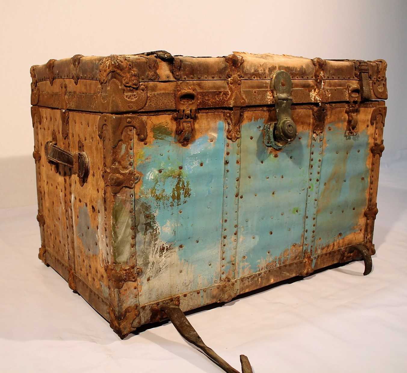 Baúl de madera antiguo, estilo colonial del siglo XX, con aplicaciones en cuero. Color azul y naranja. Remates con tachuelas y correas de cuero. Fabricado en Cienfuegos, Cuba.