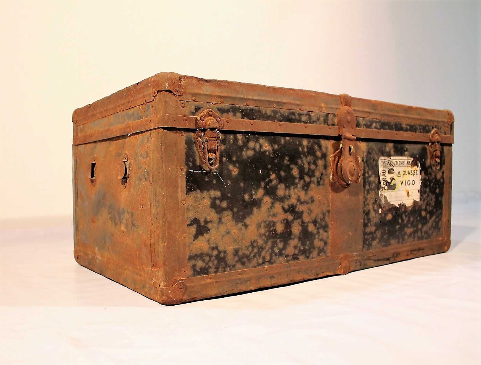 Maleta de viaje hecha de madera color negro del sigo XX con acabados metálicos. Cierre central y dos laterales auxiliares. Interior forrado en estado acorde a su antigüedad.