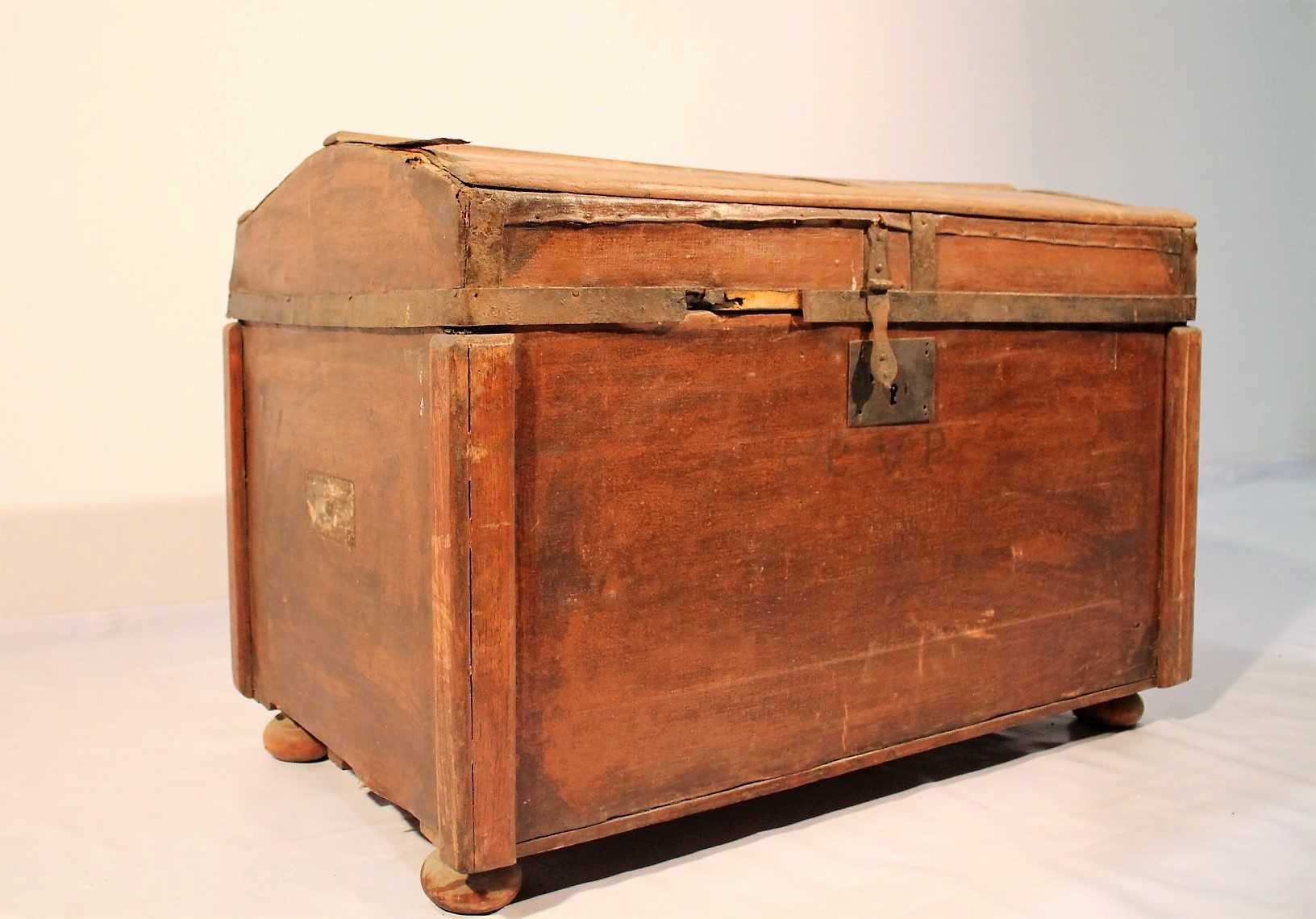Maleta de viaje hecha de madera color negro del sigo XX con acabados metálicos. Cierre central y dos laterales auxiliares. Interior forrado en estado acorde a su antigüedad.