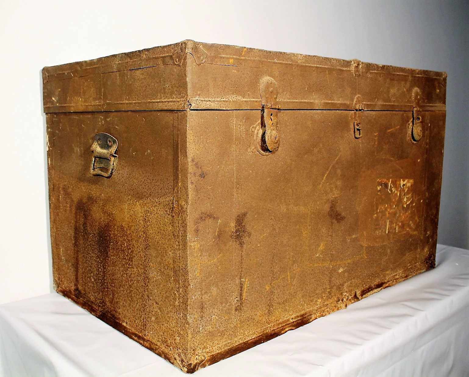 Baúl metálico del siglo XX, con 3 cierres frontales y dos asas laterales para su fácil agarre. Ideal para la decoración de interiores.