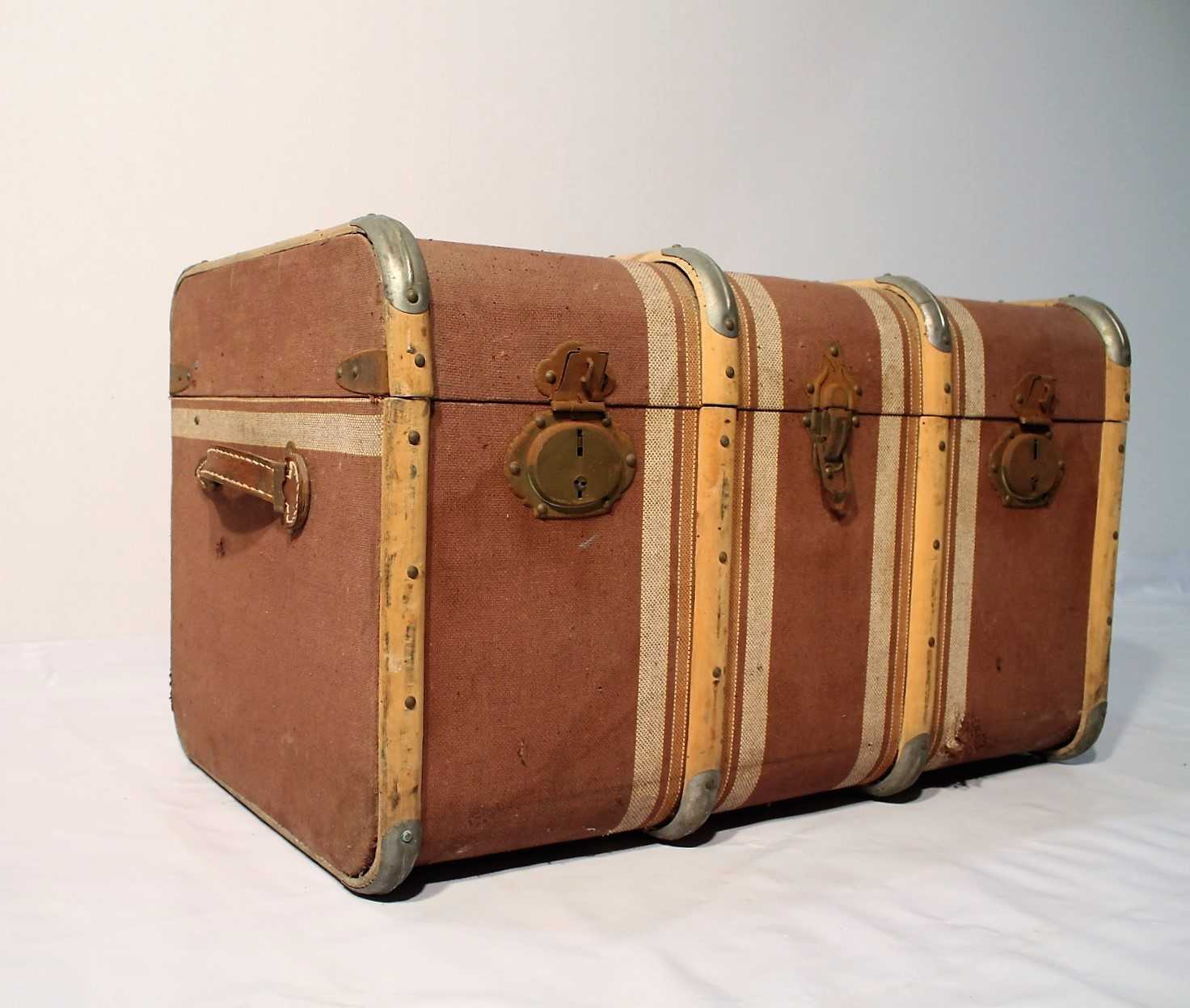 Maleta de madera del siglo XX en color granate con franjas color beige y naranja. Dos cierres frontales y asas laterales para su fácil agarre.