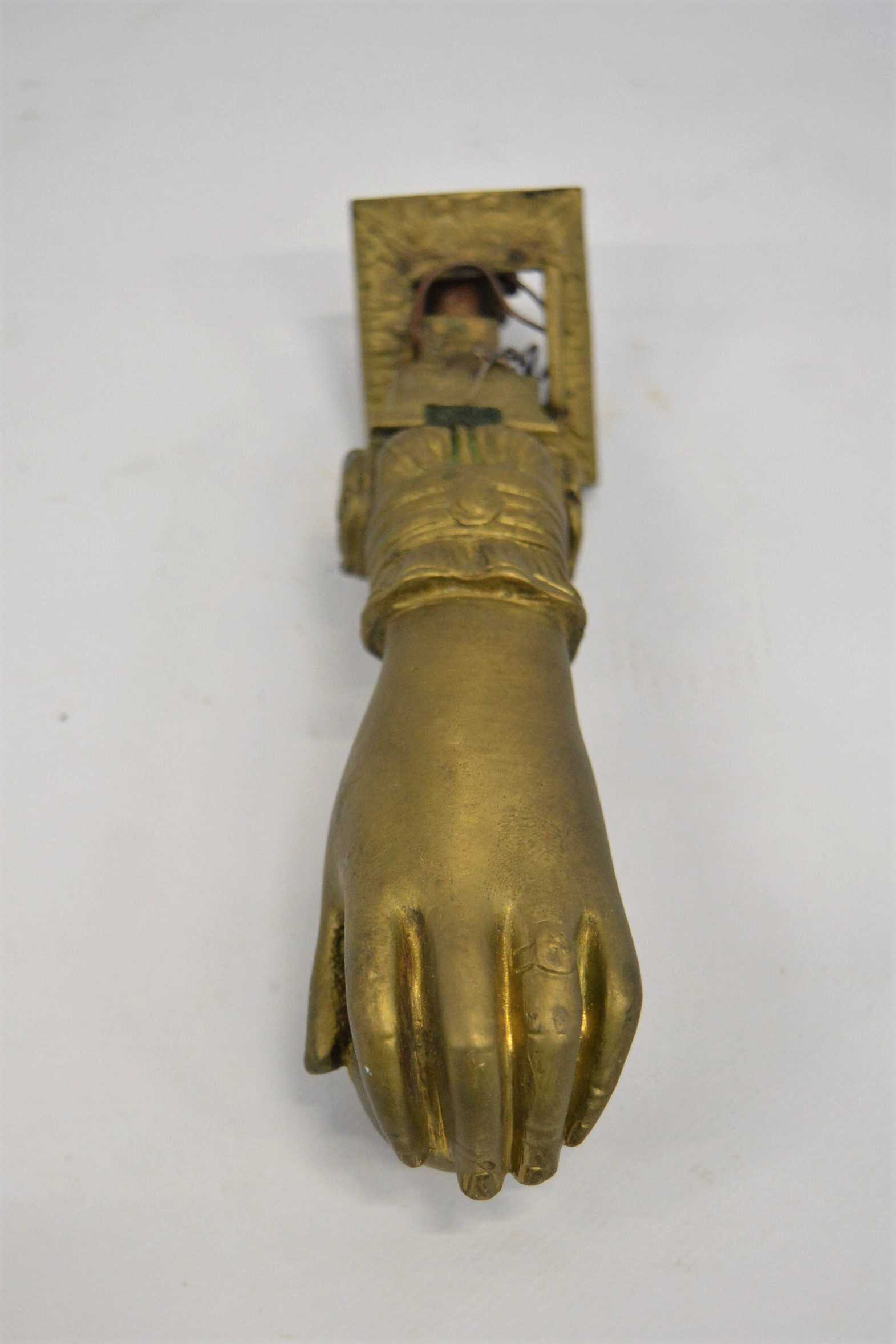 Llamador para puerta antiguo, hecho de bronce, con forma de mano.