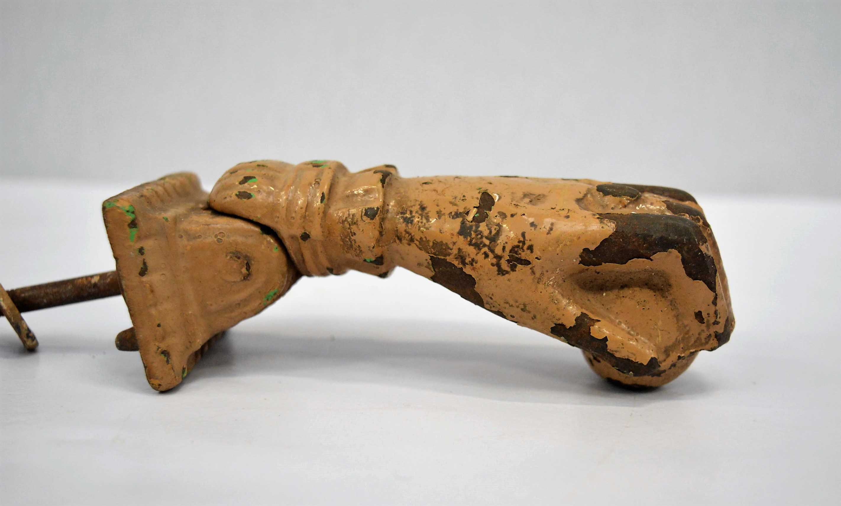 Antiguo llamador metálico para puertas, con forma de mano y esfera.