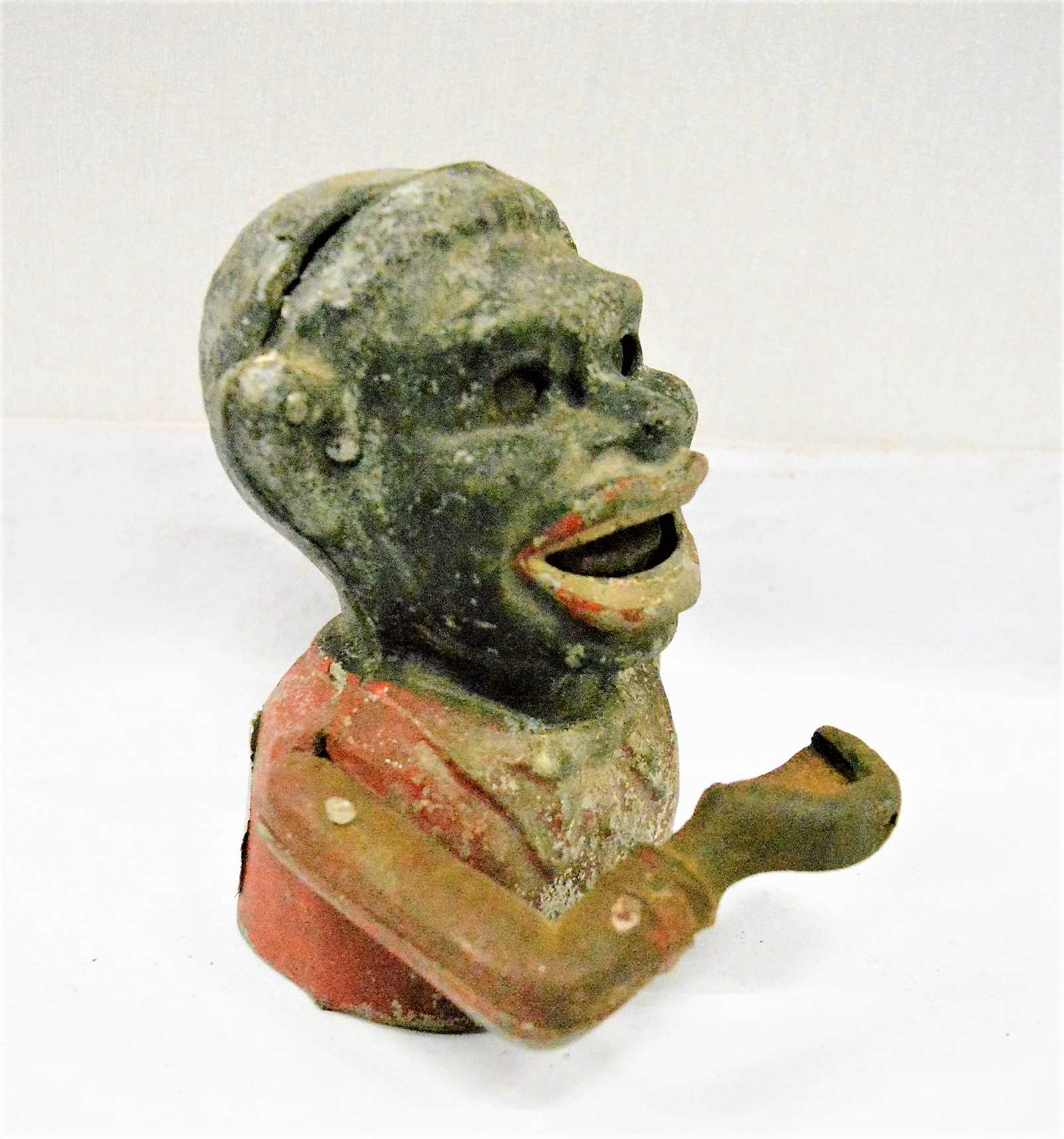 Antigua hucha fabricada en metal. Funciona colocando la moneda en la mano y girando el brazo hacia la boca. Es un objeto único para coleccionistas.