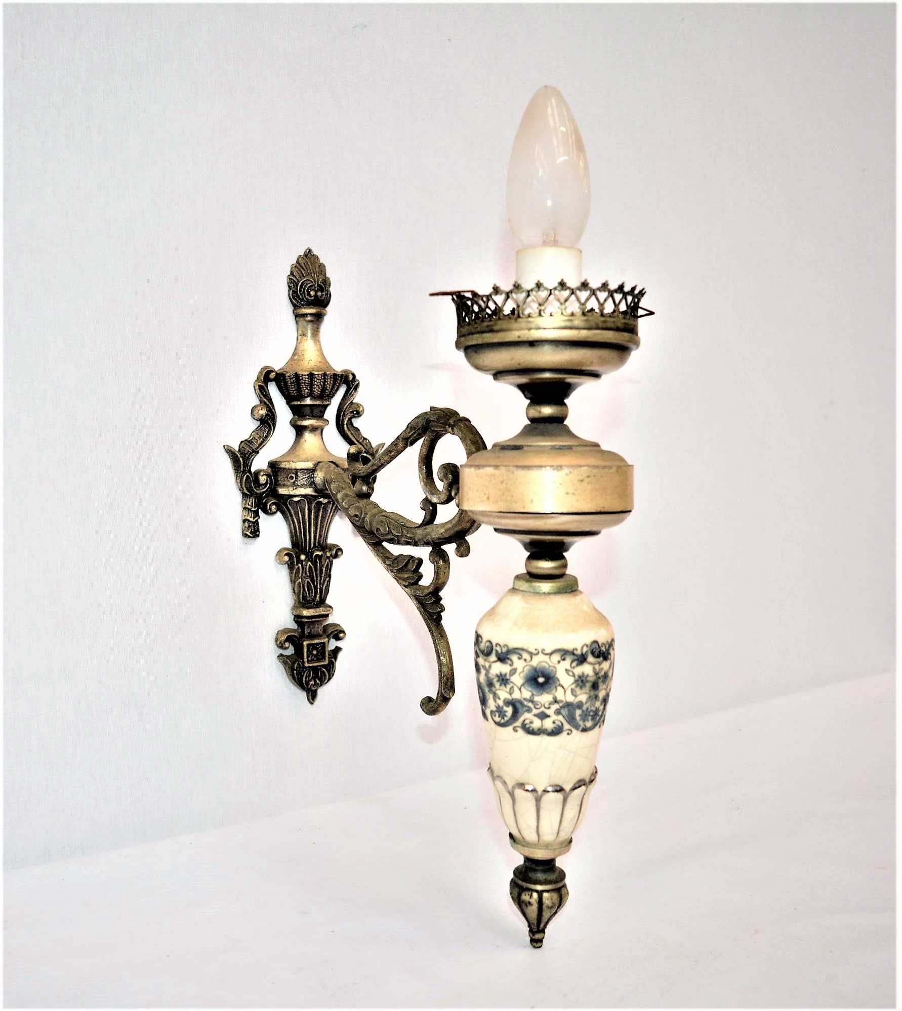 Antigua lámpara de pared hecha en metal y porcelana.