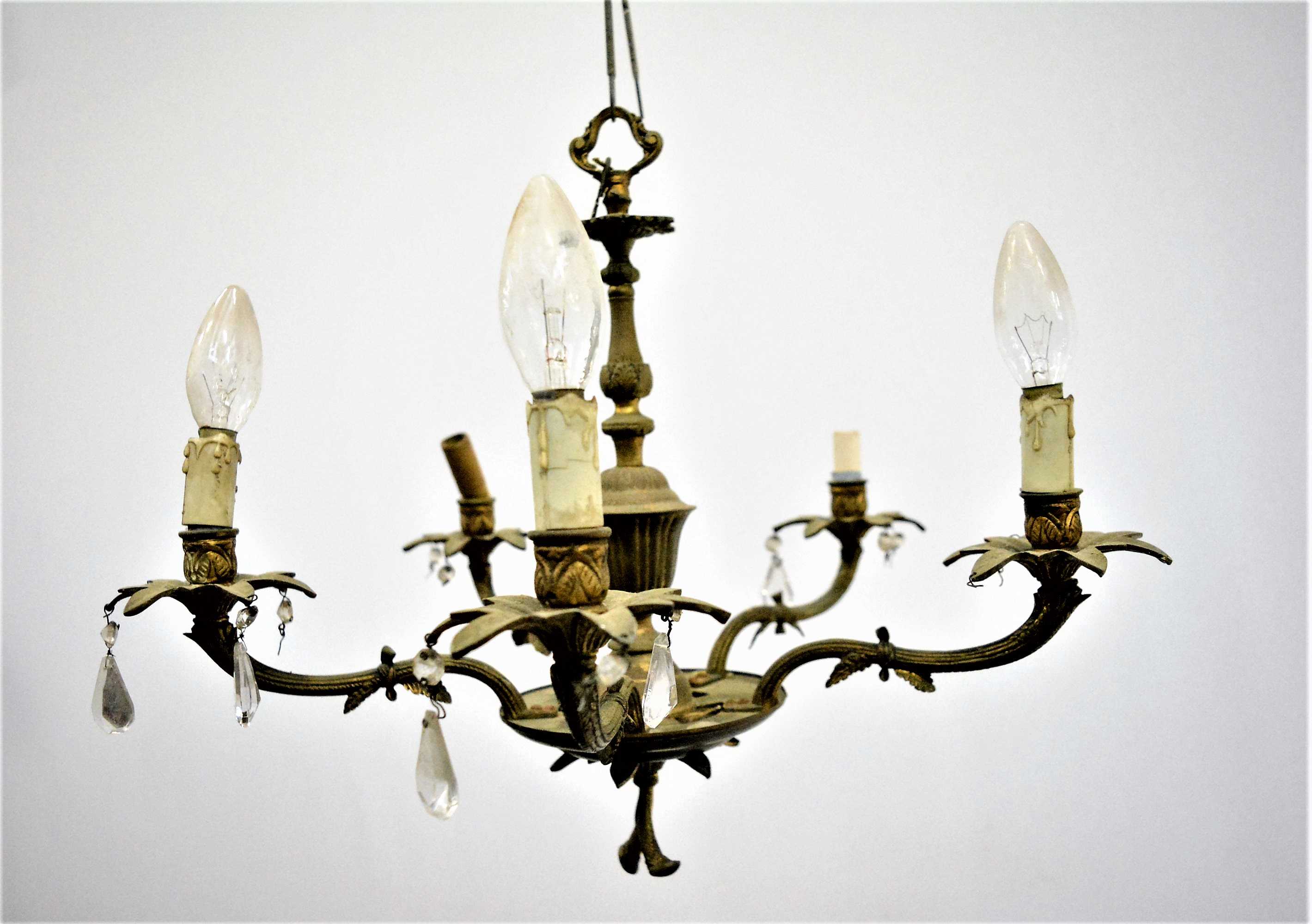 Antigua lámpara de cinco brazos en color dorado.