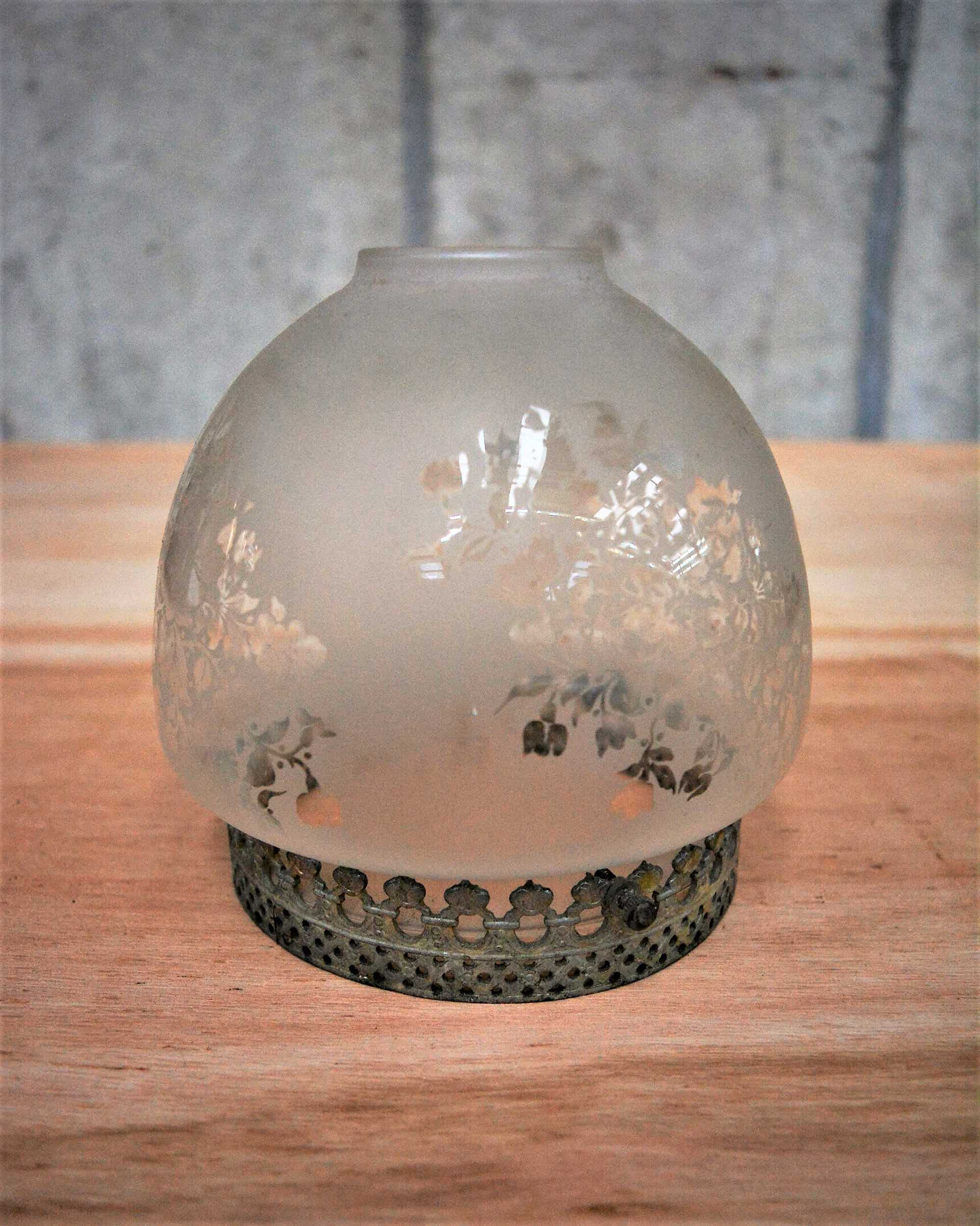 Tulipa de cristal antigua lacada con base de metal y motivos florales.