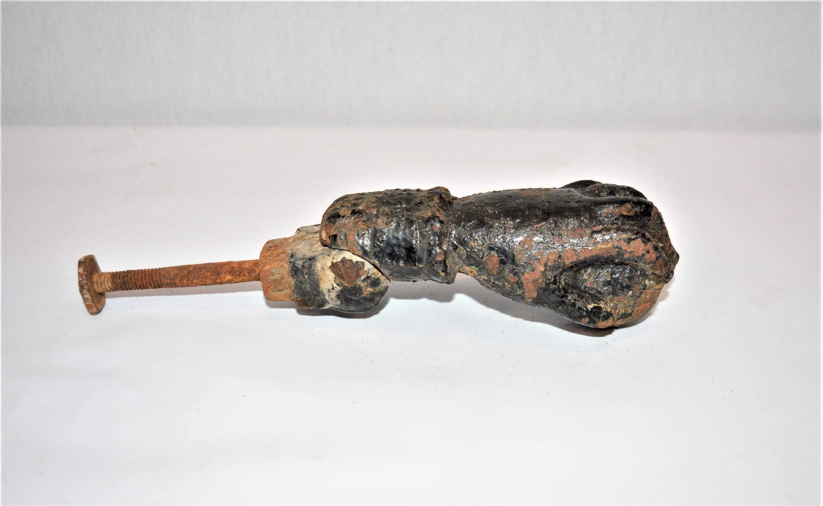 Antiguo llamador de hierro con forma de mano en color negro.