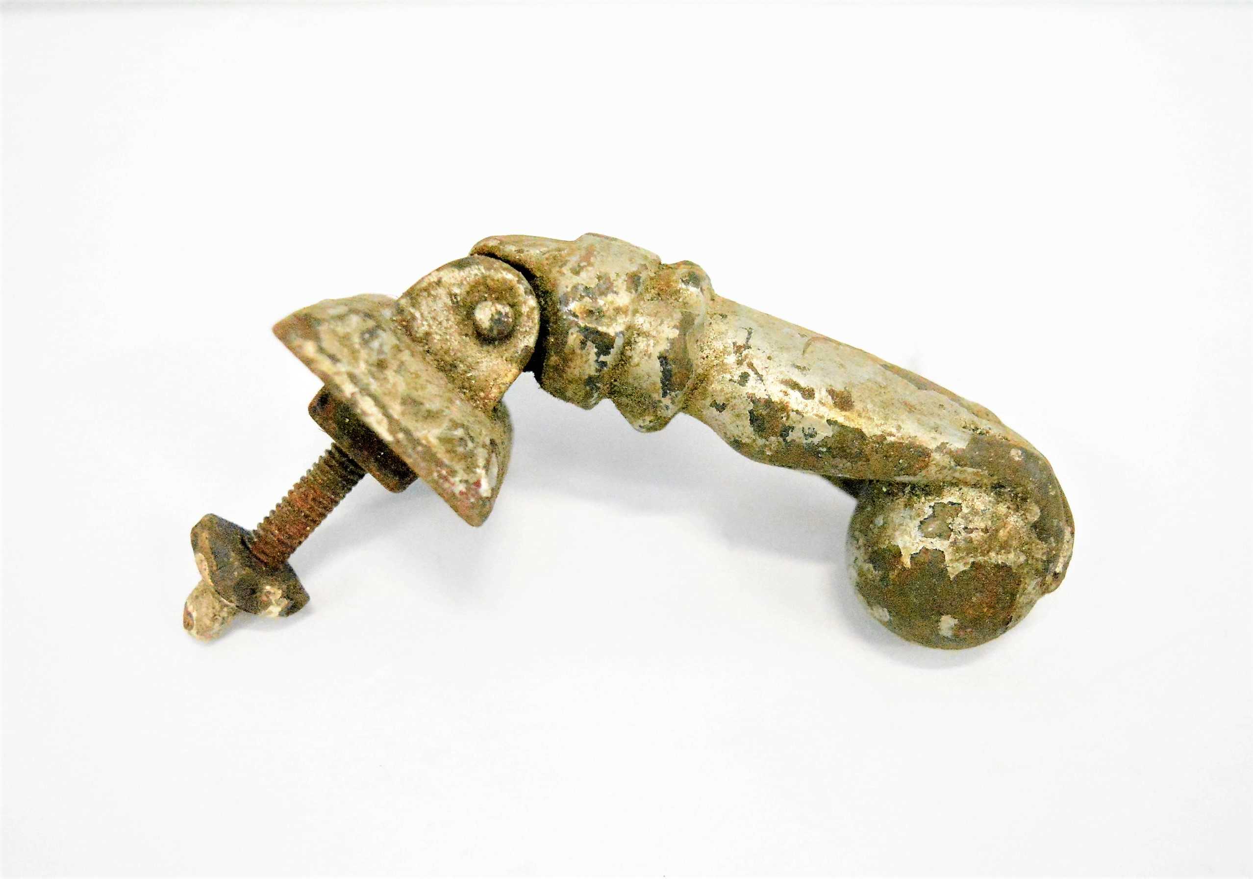 Antiguo llamador para puertas de hierro con forma de mano.