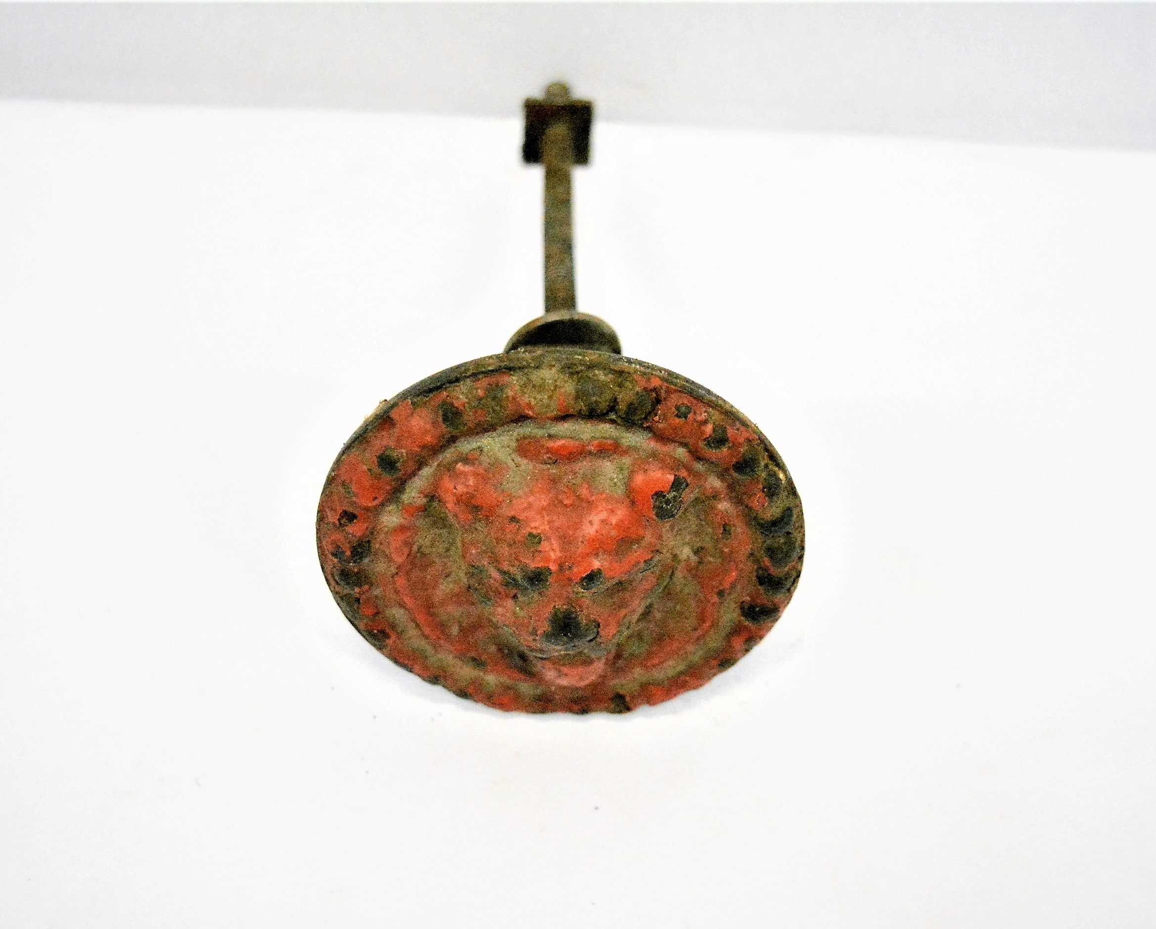 Pomo circular de hierro con un tigre forjado en color rojo.