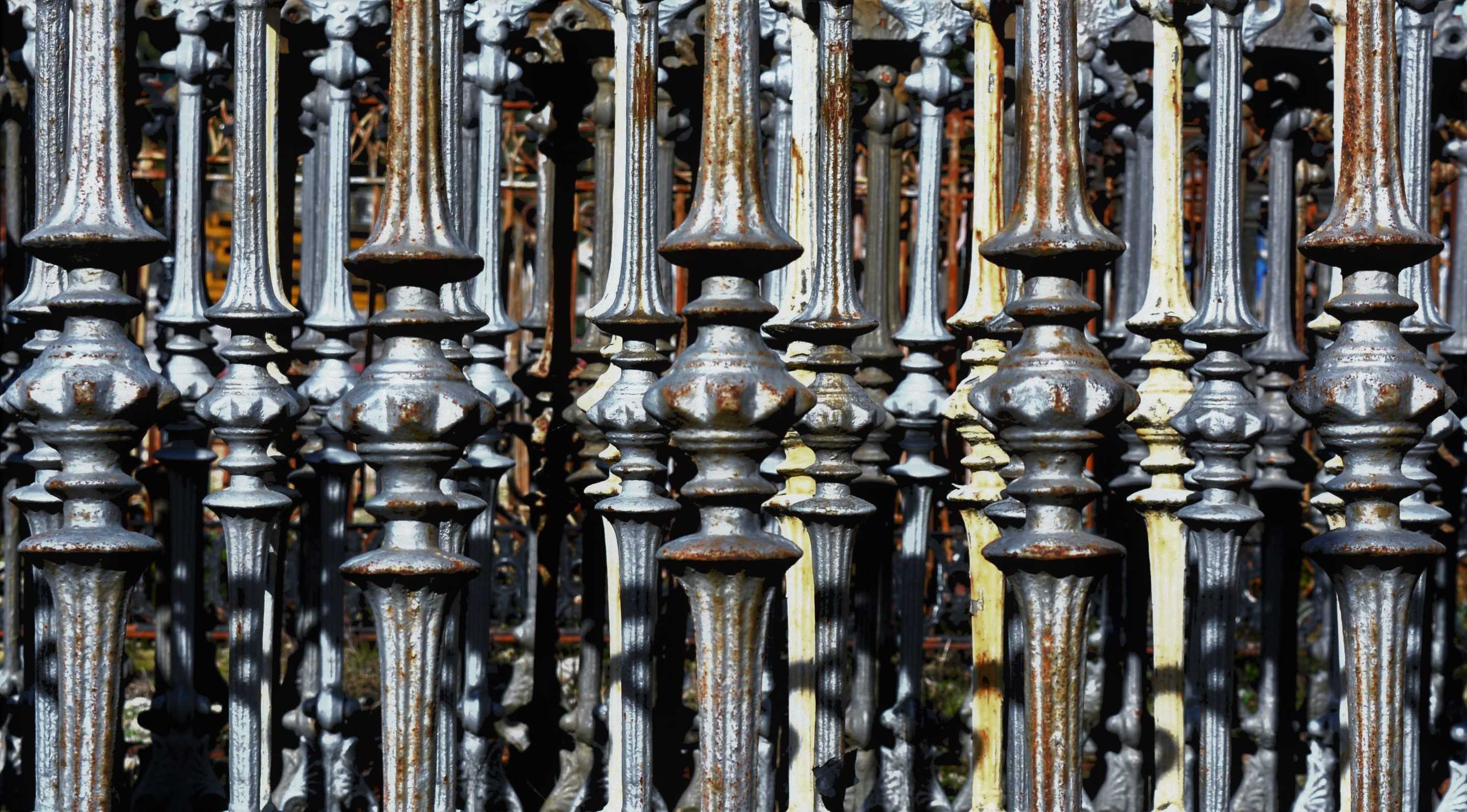 Balcón de hierro de fundición con forma rectangular en color plateado.