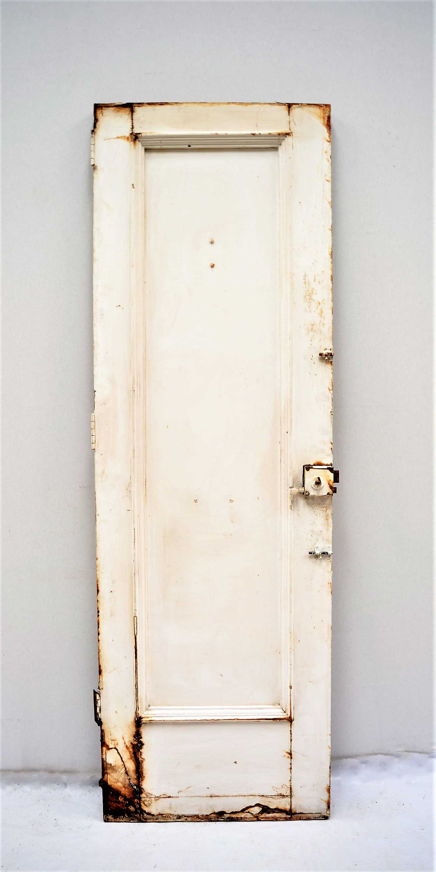 Puerta de entrada de madera con dos cerraduras, dos pasadores, llamador y tirador de hierro.