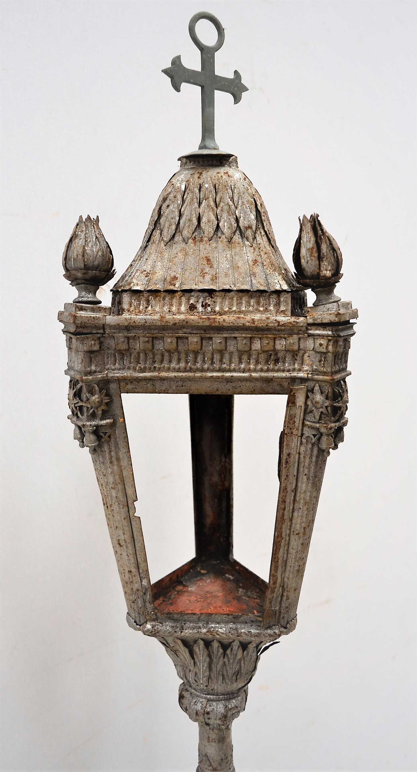 Antiguo candelabro de hierro forjado, con farolillo superior, donde colocar la vela , y un acabado en cruz latina.