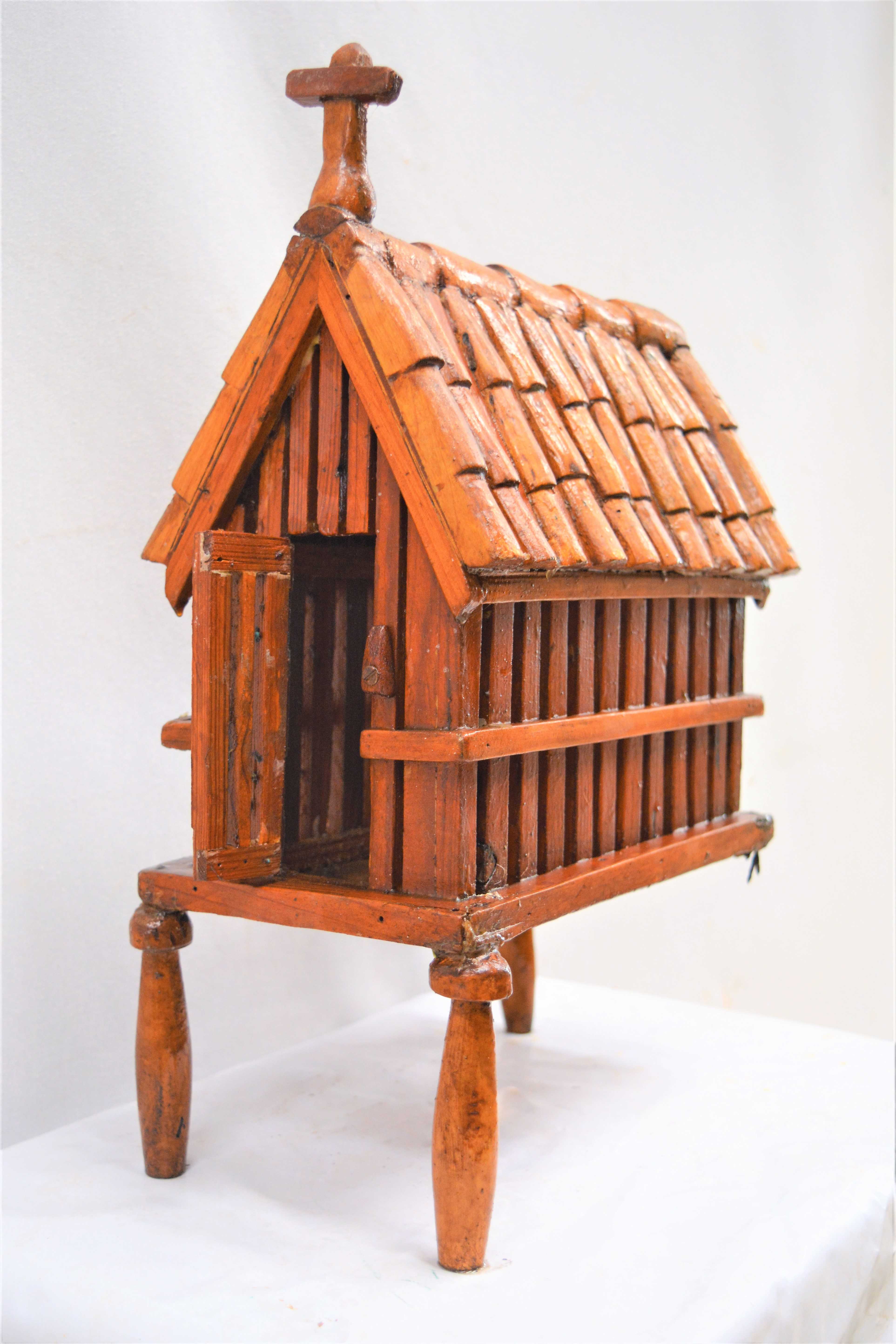 Escultura de madera en la que se representa un horreo tipico gallego.