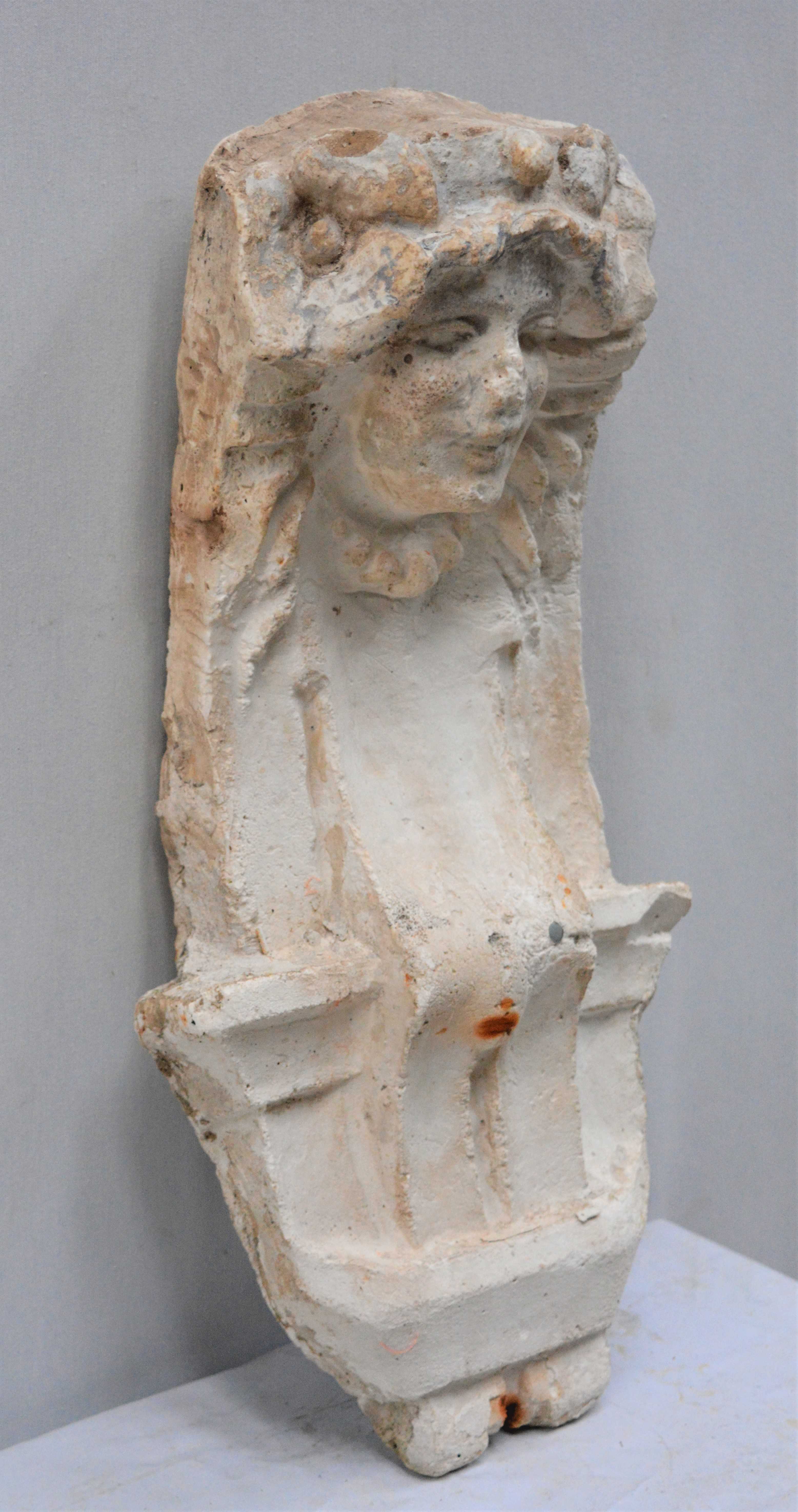 Escultura en yeso blanco de un rostro de una mujer.